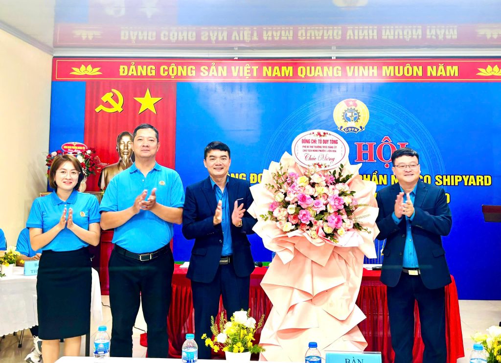 Phát biểu chúc mừng Đại hội, đại diện Công đoàn Tổng công ty Hàng hải Việt Nam và Liên đoàn Lao động Thị xã Quảng Yên biểu dương những kết quả mà Công đoàn Nosco Shipyard đã đạt được, đồng thời bày tỏ tin tưởng rằng Ban Chấp hành mới sẽ tiếp tục phát huy tinh thần đoàn kết, góp phần xây dựng tập thể lao động vững mạnh và doanh nghiệp phát triển bền vững.